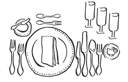 Lássuk tehát, hogy mit hol is találunk? A szalvéta kerülhet a tányérra vagy egészen balra, a villák mellé. A jobbszélen a koktélvillát találjuk, majd a kanalat. A főfogásokhoz használatos kést és villát mindig kívülről befelé haladva használjuk, azaz a külső kést és villát az elsőhöz, a belsőket a másodikhoz. Legbelülre kerülhet még a desszertes villa vagy kiskanális, de ezeket gyakran inkább a tányér fölött helyezik el. A tányér fölött balra kistányér a kenyérnek, vajnak vagy salátának, jobbra pedig a különböző italokhoz használatos poharak. Ezek sorrendje balról jobbra: vizes, vörösboros, fehérboros. A kávéscsésze helye szintén a tányértól jobbra van. Léteznek ritkábban használatos speciális evőeszközök is, melyeknek természetesen szintén meghatározott helye van a terítékben: A rákhoz valóevőeszköz, a csigafogó, a homárfogó a tányértól balra, a homárvilla, a csigavilla, az osztrigavilla, a fondüvilla, a kaviárkés, a kaviárkanál a tányértól jobbra találhatók. Még néhány apróság: A használt evőeszközt soha ne tegyük a terítőre! Ha még szeretnénk fogyasztani az adott fogásból, akkor a tányér két oldalára támasztva tegyük le evőeszközünket, ha már befejeztük, akkor tegyük őket egymás mellé, úgy hogy nyelük jobbra lefelé mutasson. |